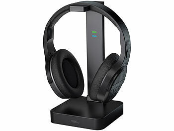 - Kopfhörer mit integriertem Li-Polymer-Akku mit 800 mAh für bis zu 20 Stunden Laufzeit, lädt über Basis/Ladestation