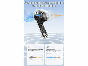 - Stromversorgung Ohrhörer: je Li-Ion-Akku mit 40 mAh für bis zu 5 Std. Laufzeit ohne ANC, 4 Std. mit Anc