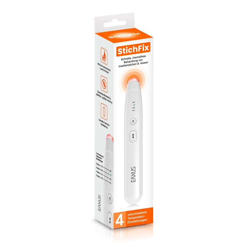 Ob Mückenstich, Wespenbiss oder Spinnenbiss – mit dem Eaxus StichFix Insektenstichheiler verschaffst Du Dir schnell und ganz ohne Chemie Linderung. Dank lokaler Thermotherapie behandelst Du Stiche und Bisse natürlich, sanft und effektiv – ideal auch für empfindliche Kinderhaut.