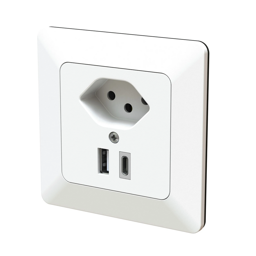 Kleinkombination Typ 13 / Ladesteckdose USB-A+C 18W / Grösse 1x1 / Unterputz / 10A / 250V / Output single Port 5-12VDC, kombi. 5VDC 15W, Protokoll: QC 2.0/3.0 PD 3.0, Samsung AFC, VIVO, FCP / inkl. Designprofil schwarz / Anbau: 10mm / Einbau.: 40mm / weiss / IP20 / modino priamos