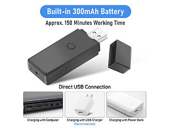- Stromversorgung: integrierter LiPo-Akku mit 300 mAh für bis zu 150 Minuten Video- und Ton-Aufnahme
