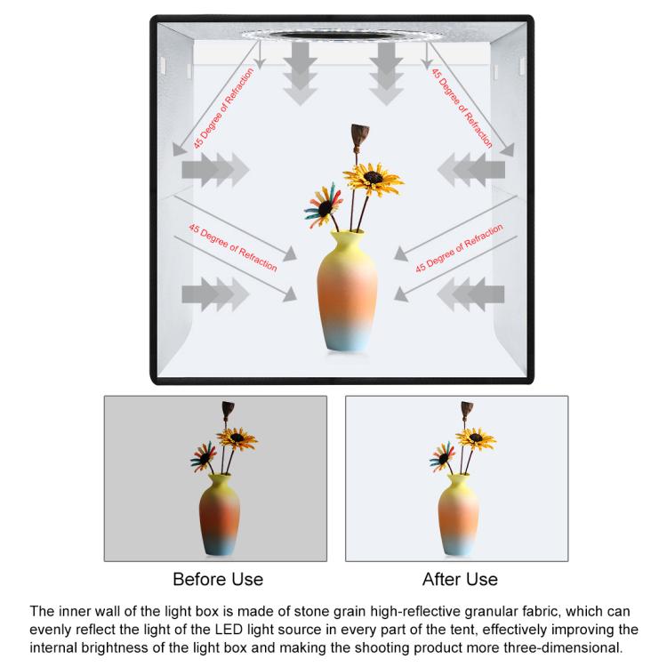 4. Tragbares Faltstrukturdesign, bequemer zu installieren und zu tragen, eingebautes LED-Licht, das durchschnittliches Licht liefert und Schatten und Reflexionen in Ihren Fotos verhindert.