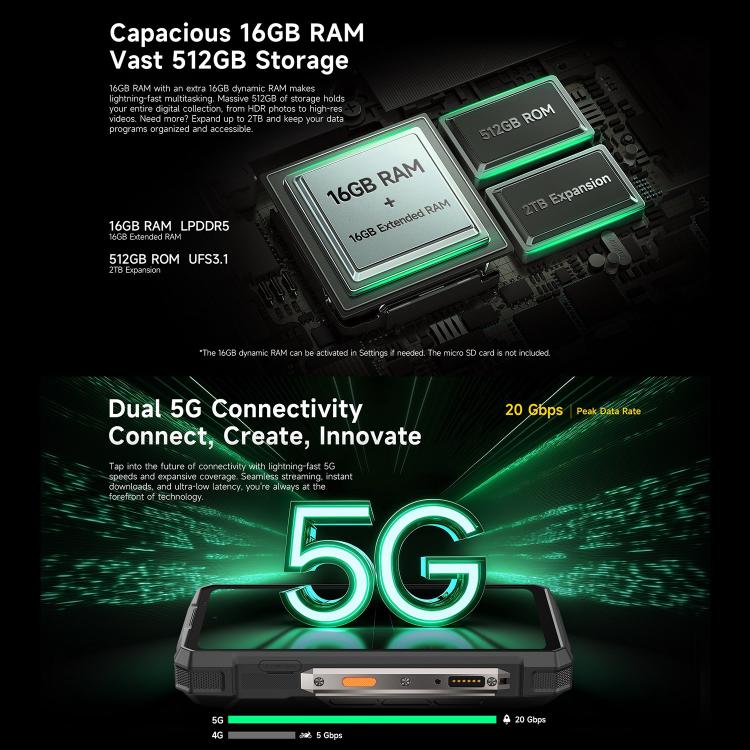 2. RAM: 16 GB LPDDR5 + 16 GB Dynamic RAM (Der Dynamic RAM kann bei Bedarf in den Einstellungen erweitert werden) + 512 GB UFS3.1 ROM