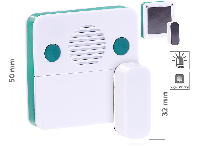 - Maße Alarmgerät: 50 x 50 x 11 mm, Türkontakt: 13 x 32 x 11 mm