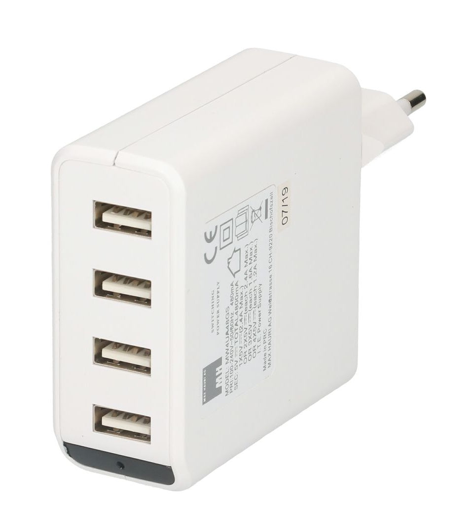 USB Ladeadapter / Eingangsspannung: 100-240VAC, 50/60Hz / Seite 1: Eurostecker Typ 26 / Seite 2: 4x USB-A Output: 5VDC max. 12W, total max. 24W / mit LED Indikator / Farbe: weiss